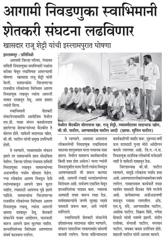 आगामी निवडनुका स्वाभिमानी शेतकरी संघटना लढविणार « ऊसबिले २० जूनपूर्वी न दिल्यास आंदोलन » ‘थ्री-जी’ सेवेचा फायदा मानवाच्या प्रगतीसाठी : शेट्टी