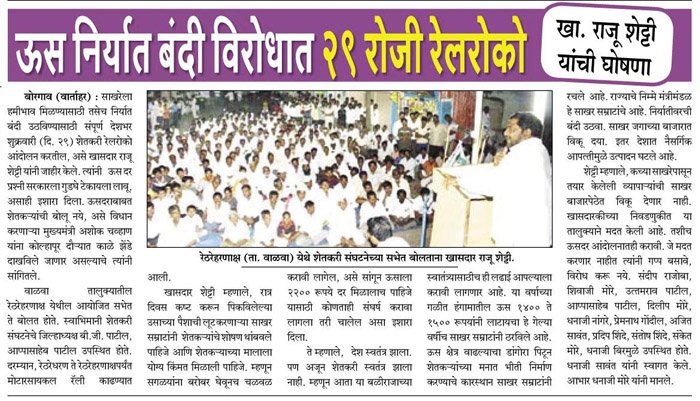 उस निर्यात बंदी विरोधात २९ रोजी रेलरोको : खा. राजू शेट्टी यांची घोषणा « अजित पवारांनी आमची मापे काढू नयेत : खा. शेट्टी » पहिली उचल २२०० दिली तरच उसतोड : शेट्टी