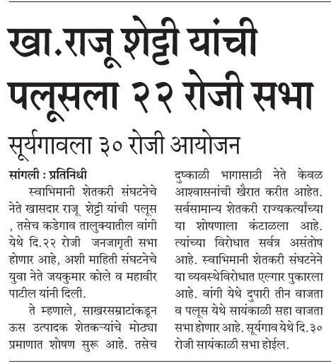 खा. राजू शेट्टी यांची २२ रोजी सभा « शेट्टींची एन्ट्री अन दुष्काळी जनतेला हाक » हद्दवाडीत शेतकऱ्यांच्या जमिनी जावू देणार नाही : खा. राजू शेट्टी