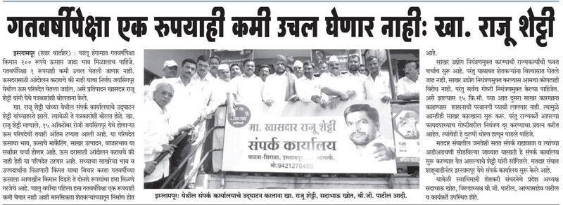 गतवर्षीपेक्षा एक रुपयाही कमी उचल घेणार नाही : खा. राजू शेट्टी « राजकरत्यांकडून उस उत्पादकांच्या हिताला मूठमाती » कारखानदारांच्या छाताडावर बसून उस दर घेऊ : खा. शेट्टी