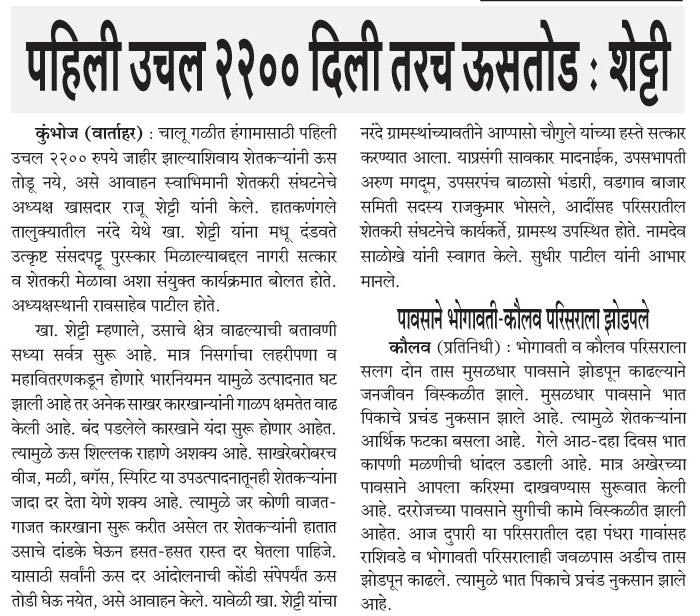 पहिली उचल २२०० दिली तरच उसतोड : शेट्टी « उस निर्यात बंदी विरोधात २९ रोजी रेलरोको : खा. राजू शेट्टी यांची घोषणा » पहिल्या उचालीवरून संघर्ष अटळ !