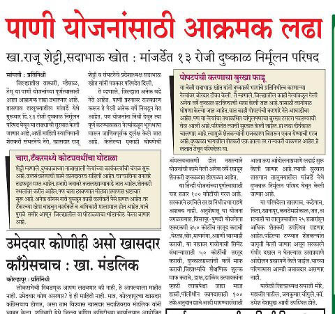 पाणी योजनासाठी आक्रमक लढा « पाणी लढ्याला ताकत ध्या : खा. राजू शेट्टी » बिअरसाठी पाणी ; शेतीसाठी , प्यायला का नाही ? – राजू शेट्टी यांचा सवाल