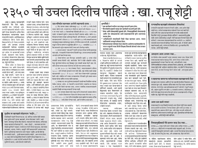 २३५० ची उचल दिलीच पाहिजे:खा. राजू शेट्टी « प्रमाणिक आन्दोलनामुलेच शेत्कर्यना २०५० दर » टोलरुपी खंडनी वसूल कराल तर पयाताना कडू:खा.शेट्टी