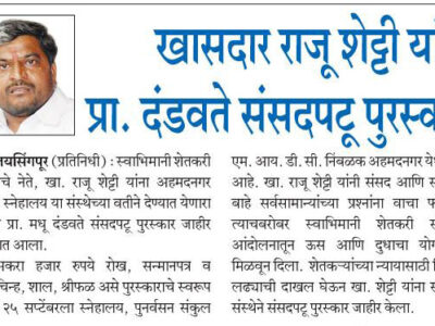 खासदार राजू शेट्टी यांना प्रा. दंडवते संसदपटू पुरस्कार